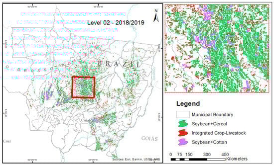 Stimulated by sectoral public policies, such as the ABC Plan, the monitoring the iCLs expansion area, on a national scale becomes extremely relevant for the sectoral management from the Agriculture Ministry of Brazil, which needs information to assess the level of adoption and the impact of these public policies. However, so far, the estimate of the implementation of these systems is made by surveys that are costly in time and resources, which is mostly carried out through interviews with cooperatives and producers [,]. Therefore, the development of monitoring systems that can automatically provide, updated information is strongly required.