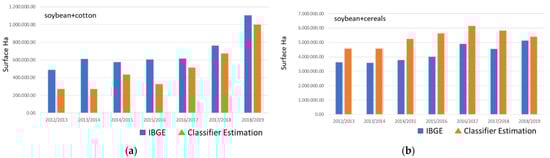 Parente et al. [,] use a combination of data collected by field campaigns and photo-interpreted data in order to map pastures. In the case of sequential cropping systems, the datasets are generally derived from interviews with producers and cooperatives, supplemented by data collected in the field [,,,,]. The identification of these systems remains very difficult by photo-interpretation, even for specialists, because they are very dynamic and diverse systems, with different classes of pasture and annual crops (soybeans, cotton, etc.). The strategy of collecting field data through interviews with producers in the region is necessary because, in the case of its sequential crops, a visit made on a single date does not identify the complete production system. In most studies, however, this strategy is limited because it does not allow collecting a large number of samples over large areas and remains problematic for poorly represented classes, such as integrated systems.