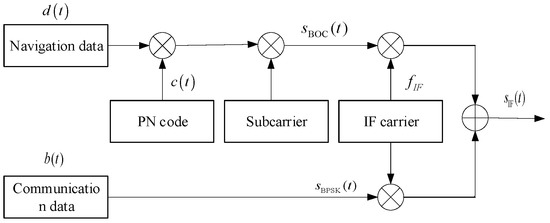 To obtain a multifunctional signal, the paper adds the BPSK signals at the central frequency point of the BOC signal. At present, the combination of BPSK and BOC modulation is mostly used for global navigation satellite system (GNSS) navigation signals. Deepak Mishra uses interplex modulation to combine three signals at the same frequency [24]. The interplex modulator forms the signal of the in-phase (I) channel and the quadrature (Q) channel signal as a constant envelope signal by phase modulation. Cahn et al. use phase-optimized constant envelope a transmission method to achieve multiplexing at the same frequency [25]. The method can finish phase modulation through optimized algorithm. However, these methods should modulate PN code on each signal to distinguish each other, and cannot achieve high-speed data transmission. He Ting and Ma Zherui propose an integrated signal based on orthogonal frequency division multiplex (OFDM) and BOC modulation [26]. The OFDM signal can accomplish high-speed data transmission, and the BOC signal achieves measurement and navigation. The power of the BOC signal is lower than the OFDM signal in order to protect the OFDM signal from interference.