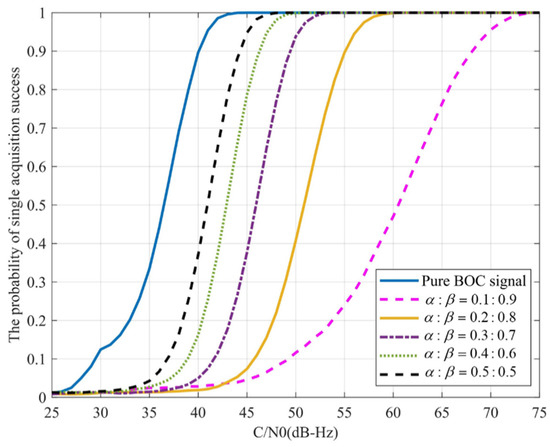 Figure 9 shows the single acquisition success probability under different BOC and BPSK power ratio Monte Carlo simulations. When the ratio of and is greater than 0.3:0.7, the main factor for the reduction of the acquisition probability is the reduction of the proportion of BOC signal power in the composite signal. When the ratio of and is less than 0.3:0.7, the power of the BPSK signal will interfere with the acquisition of the BOC signal. Therefore, if the system is in a low carrier-to-noise (C/N0) environment, it is reasonable to use . However, when the C/N0 is higher than 70 dB-Hz, the power of the BOC signal can be reduced to improve communication performance.