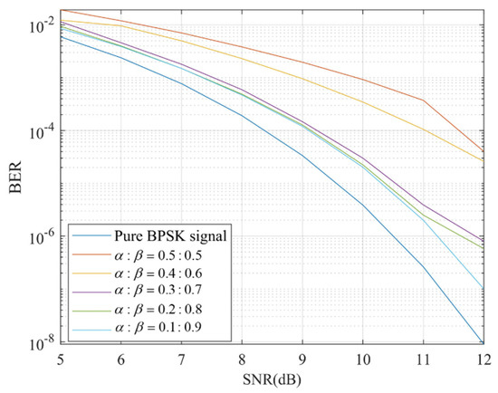 According to Equation (6), the communication signal and the BOC signal are orthogonal in the time domain. Therefore, as long as the chip accumulation time of the BPSK signal is the length of one chip of the BOC signal, the BOC signal cannot affect the demodulation of the BPSK signal. The bit error ratios (BERs) of the BPSK signal at different SNRs and ratios are shown in Figure 11. This shows that the demodulation of the BPSK signal is only influenced by the BPSK signal power in the composite signal. When the proportion of the BPSK signal in the composite signal is 50%, the signal power needs 3 dB more than the pure BPSK signal to meet the same BER.
