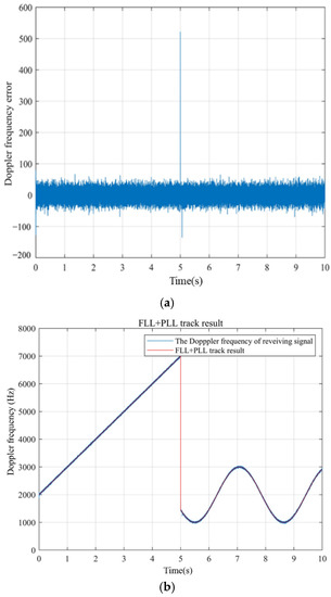 The switching time when and C/N0 = 45 dB-Hz. (a) the Doppler frequency error, and (b) the Doppler frequency measurement.