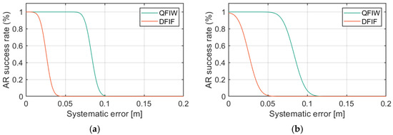 AR (ambiguity resolution) success rates of DFIF (double-frequency ionosphere-free) and QFIW (quad-frequency ionosphere-weighted) models under different system errors and phase errors: (a,b).
