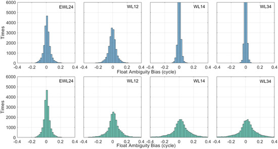 The floating solution biases of WL ambiguities were counted, and are displayed as histograms in Figure 5. The upper panel shows the result after ionospheric correction, and the lower panel shows the result without ionospheric correction. It can be seen from the figure that the WL floating solution bias after ionospheric correction was more concentrated around 0 cycle, and most deviations are less than 0.1 cycles, especially for combinations WL14 and WL34.