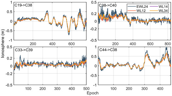 In order to further improve the accuracy of the estimated ionospheric delay, three sets of uncorrelated WL observations (WL12/WL14/WL34) were selected for calculation, and the optimal value was estimated by LSE. Figure 6 shows the ionospheric delay calculated by various EWL and WL observations. It can be seen that had the largest noise, and and had the smallest noise, which is consistent with the theoretical value of the noise amplification factor given in Table 2. Ultimately, the amplification factor of the noise of the ionospheric delay estimated by LSE was about 4.5, corresponding to the basic ambiguity deviation of about 0.1 cycles.