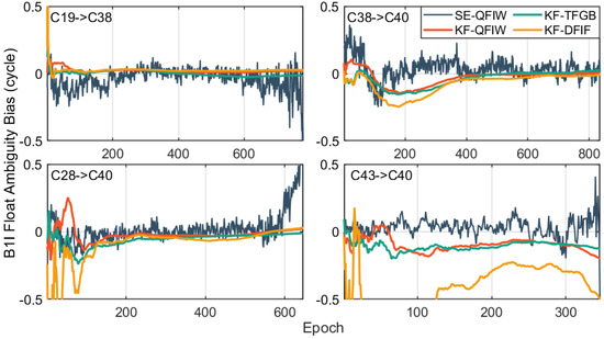 The B1I float ambiguity bias calculated by the QFIW, TFGB (triple-frequency geometry-based) and DFIF model.