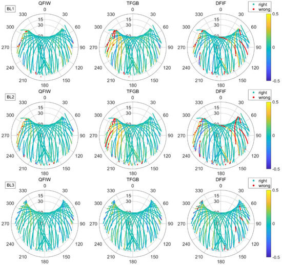 In order to compare the accuracy of the three processing models intuitively, we drew sky maps of the float ambiguity bias, as shown in Figure 8. From top to bottom in the figure are baselines BL1, BL2, and BL3. Red dots indicate deviation of more than 0.5 cycles, and other colors indicate deviation of less than 0.5 cycles. The corresponding relationship between bias and color is shown in the color bar on the right side of the figure. It can be seen from the figure that the floating ambiguity bias of the QFIW model was more than 0.5 cycles at individual low-altitude satellites only sporadically. However, there was a significantly larger proportion of float ambiguity bias of more than 0.5 cycles in the DFIF model, and some satellites exceeded the limit for a long time. The result of the TFGB model is between the two.