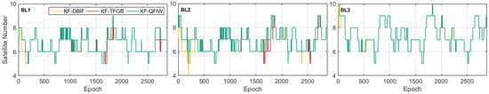 In addition, we made a comparative analysis of the two models on a time scale, and drew a time-sequence diagram of the number of satellites successfully fixed by the two models. It can be seen from Figure 9 that the QFIW model successfully fixed more satellites than the DFIF and TFGB models. In the initialization phase, the advantages of the QFIW model were more obvious. Within 300 s after initialization, the number of satellites it successfully fixed was 7.7, 13.3, and 2.1% higher for the three baselines compared to the DFIF model.