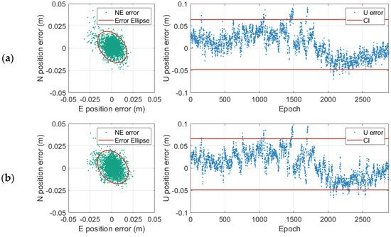 Interpolating ionospheric and tropospheric delays at the user’s position is the key to realizing the user’s high-precision positioning. Based on basic ambiguity fixing, the ionospheric and tropospheric delays at each baseline could be calculated, and the atmospheric error at the user’s position could be interpolated by LIM/LSM/DIM or other models. In this study, the LSM model was selected for atmospheric interpolation [26], and the user positioning results are shown in Figure 10. The green and blue dots in the figure comprise a scatter diagram of positioning error, and the red line represents the error ellipse or 95% confidence interval (CI). The root mean square (RMS) values of the positioning results were 0.0069/0.0072/0.0281 m for E/N/U directions, respectively, for the QFIW model, 0.0073/0.0076/0.0288 m for the TFGB model, and 0.0085/0.0103/0.0342 m for the DFIF model. It can be concluded that using the QFIW model to fix the ambiguity between reference stations could significantly improve the user’s positioning accuracy.