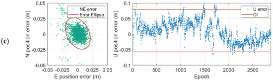 User positioning errors by three models: (a) QFIW; (b) TFGB; (c) DFIF. (N means north direction, E means east direction, NE means north and east directions, U means up direction, CI means confidence interval).