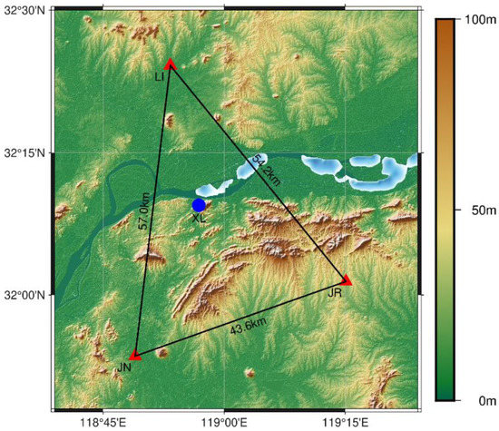 For the first CORS network, the base stations and user station had the same types of receivers and antennas—Trimble Alloy receivers and TRM159900.00 SCIS antennas. The average length of three baselines is close to 100 km, and the maximum height difference between base stations is up to 1000 m. Observations of day of year (DOY) 148 in 2020 were used for experimental verification in this study. The elevation mask was set to 10°, and the sample rate was 30 s. Figure 3 displays the geographical location of the stations. The broadcast ephemerides were used to assess the satellite ORTs in real time. The tropospheric delay was mitigated by an empirical model, saastamoinen + GPT2_1w. The receiver antenna phase offset was ignored, as the same antenna type was used. The quad-frequency DD algorithm was used in the data processing, and the ambiguities of each epoch were resolved by Kalman filter. With all ambiguities resolved, accurate tropospheric and ionospheric delays of each baseline could be calculated, which were then used to interpolate the atmospheric delay at the user’s position and finally generate virtual observations.