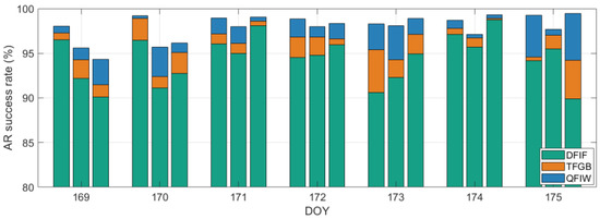 Figure 12 shows the ambiguity fixing success rate of three baselines for seven consecutive days under the two models. The three bars, from left to right, for each day represent baseline JN-JR, JN-LI, and JR-LI, respectively. It can be seen from the figure that the QFIW model had a better success rate than the TFGB and DFIF models for all baselines on all days. The success rate increased from 94.4 and 96.1% to 98.0% compared with the DFIF and TFGB models.