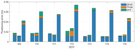 Figure 13 illustrates the user positioning errors under the three models. The three bars, from left to right, for each day represent E, N, and U directions. It can be seen from the figure that the positioning errors were better for the QFIW model than the DFIF and TFGB models on all seven days. For the QFIW model, the plane positioning error was always better than 2 cm, while the maximum vertical error exceeded 6 cm, which may have been caused by large atmospheric modeling error and multipath delay.