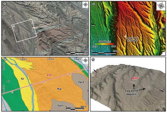 From west to east, a ~48-km-long NEE-striking surface rupture zone is developed along the KTF (Figure 2). The surface rupture zone starts near Ta. village in the west, cuts through the terraces of the Ayakeqianake river, the T1 of Boguzi river to the south of Keketamu village (Figure 8e), and the alluvial terraces and fans around the Kalawengkuer. Eastward, the linear trace becomes unclear to the north of Kalatage Mountain, revealing the termination of the surface rupture zone (Figure 1c and Figure 2a,b). In the north of Keketamu, the surface rupture zone exhibiting a NE-NEE-striking 2-km-long branch, which displaced the alluvial fans in the front of Kalawengkuer. The trace of surface rupture zone is straight in the west of Keketamu and in the east of Kalawengkuer with an NEE striking, an NE-striking bend is developing in the Pre-Quaternary sedimentary rocks, which is connecting them in the south of Kalawengkuer (Figure 2b).