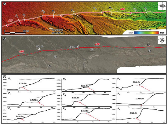 In the middle segment of ATF (as shown as Site 3 in Figure 3b), the 3.5 km-long continuous fault scarp with a striking of W-E is developed on T2 (Figure 6a,b). The topographic profiles derived from the DSM generated by UAV show that throws of fault scarps ranging from 2.2 m to 2.7 m (Figure 6c), which is consistent with the measurement of the fault scarp during the field investigation, the surface shortening in this place ranging from 4.1 m to 5.0 m. In addition, there is an eastward flowing temporary stream along the striking of fault scarp, which formed a series of erosion scarps in front of the fault scarp (Figure 6c). The difference between two kinds of scarps is the heights of scarp that formed by erosion varied along the flow direction; in contrast, the throws of the fault scarp exhibit a good consistency along the fault strike (Figure 6c).