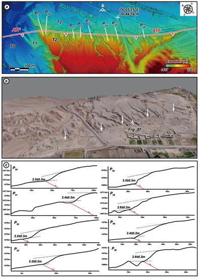 Here, R is the ground resolution (cm/pixel), H is the flight height (m), Sc is the pixel size (mm × mm), and f is the focal length (mm). DSMs, orthomosaic images, and three-dimensional tectono-geomorphic models were generated via the Pix4D software. Topographic profiles are not always precisely perpendicular to the fault scarps to ensure that profiles were derived from the same geomorphologic surface, as well as the place where erosion or degradation is minimal to reduce uncertainties in geomorphic surface shapes. In each profile derived from UAV-based high-resolution DEM data, trend lines fitted to represent for the original geomorphic surface were projected onto the fault trace to measure the vertical offset [19,27]. Other topographic profiles could be acquired from the AW3D30 in the same principle.
