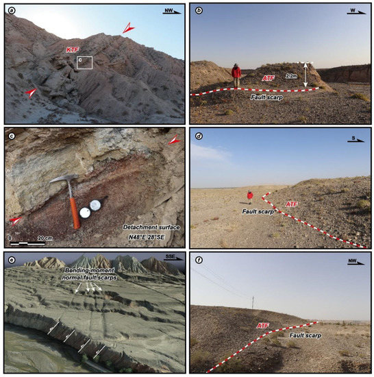 Typical field photographs showing the surface rupture zones observed along the ATF and KTF. (a) Photograph showing the development of active fault and collapse in Kalawengkuer, collapses are comprised of N1 sandstone and siltstone. Location is shown as Site 2 in Figure 2b and Figure 5b; (b) photograph showing a ~2.2-m-high fault scarp developed on T2, as a result of the 1902 Mw 7.7 Atushi earthquake. Location is shown as Site 3 in Figure 3b and Figure 6b; (c) enlarged photograph showing the fault plane (as shown in (a)) developed in the detachment layer, which consists of brownish red and grayish yellow siltstone, argillite, and gypsum; (d) photograph showing the surface deformation is characterized as fault scarp developed on T2, which was produced by the 1902 Mw 7.7 Atushi earthquake. Location is shown as Site 3 in Figure 3b and Figure 6b. (e) UAV-based 3D visualization of bending-moment normal fault scarps in the south of Keketamu (as shown in Figure 2b). Four north-facing scarps, which developed at the core of KTA, are sub-parallel, closely-spaced arrangement; (f) photograph showing the surface rupture characterized as fault scarp, which is likely related to the 1902 Mw 7.7 Atushi earthquake. Location is shown as Site 4 in Figure 3b and Figure 7b.