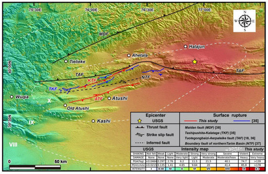 Surface rupture zones and seismogenic faults mapped by our study compared with that given by the previous studies on the 1902 Mw 7.7 Atushi earthquake. The seismic intensity map is produced based on the data from United States Geological Survey (USGS) and [18]. Red and blue lines displaying the spatial distribution of surface rupture zones revealed by this study and [35], respectively.