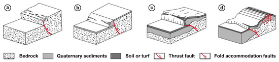 Typical surface structural deformation features developed along the ATF and KTF surface rupture zones. (a) bedrock scarp; (b) hanging wall collapse scarp; (c) pressure ridge; (d) main thrust faulting and bending-moment normal fault scarps. The moving and bending of the bed in the anticlinal hinge can amplify the bed curvature to generate bending-moment normal faults (as shown in Figure 8e) [50]. The structural models are modified after [59].