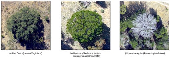 The creation of accurate maps depicting the spread of woody plants across the Edwards Plateau provides a basis for identifying and classifying the encroaching species, which can help landowners better manage their properties. Understanding settlement patterns and structure of encroaching woody plant expansion over large areas also enables scientists and conservationists to scale up the impact of woody plant encroachment into native grasslands and savannas, making the phenomenon more accessible to the general public. Instead of traditional field sampling methods, a more practical and economical means of studying large areas is now offered by remote sensing—especially given the growing abundance of affordable aerial drones on the market. In 2016, two months after mandating a nationwide drone registry, The Federal Aviation Administration (FAA) reported a greater number of registered drones than traditional aircraft [5]. The most popular drones for ecological purposes are “micro-drones” (weighing under 2 kg) equipped with a stabilized camera system (including 4k video), granting flight times of ~10–30 min and costing between ~ USD 300 and 5000 [5]. Furthermore, thanks to advances in autonomous flight, camera control technology, and image stitching software, novice users can learn to fly and begin taking aerial images in less than a few hours [5]. The Edwards Plateau is particularly well-suited to species classification via this methodology. First, it is characterized by a low diversity of woody plant species [6]. Second, each of the aforementioned four tree species displays a unique phenology: honey mesquite is characterized by long periods of senescence, live oak by very short periods of senescence, and blueberry juniper and redberry juniper by no period of senescence, as shown in Figure 1. These differences make it possible for land managers and scientists to use cost-effective image-acquisition methods for classifying vegetation during the transitionary period from winter into late spring. In addition, drone imagery has the capability to create 3D point clouds through photogrammetry—thereby adding vertical structure information, which improves classification results.