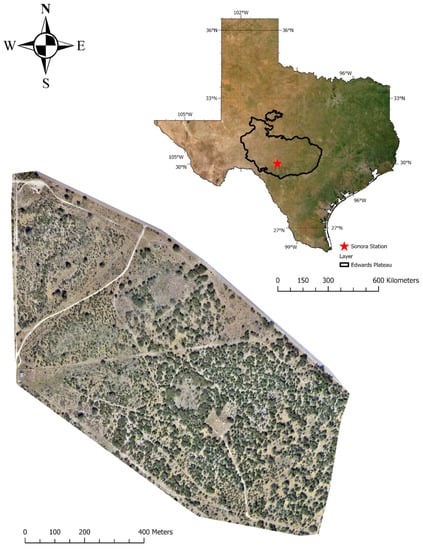 The study site (Figure 2) is located within the Sonora A&M Agrilife Research Station (latitude 30.27, longitude−100.57), which occupies approximately 1401 ha (3462 acres) in the Edwards Plateau ecoregion of central Texas. This ecoregion is generally classified as semiarid, receiving on average 550–600 millimeters of rain per year. Rainfall is distributed evenly across the year, with summer months (May to October) seeing slightly higher amounts. Soils in this region are clayey and dark in color; most soil depths measure less than 254 mm (10 in.), but in some areas they are greater than 508 mm (20 in.). The site is characterized by karst topography—generally a mix of limestone and dolomite, which can be seen rising above the surface in many areas. The region’s vegetation structure consists of mixed grasses (tall, medium, and short) and forbs intermixed with woody species [25].