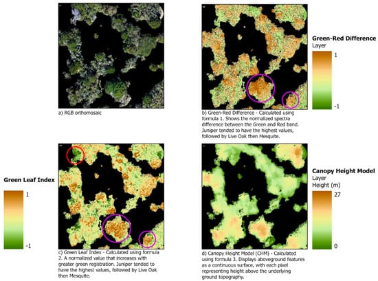 The three features were selected for different purposes. The green–red difference and chlorophyll features distinguish more finely between the various levels of greenness between tree species [26], while the canopy height model (CHM) detects differences in the height of woody plants. The three features were stacked along with the RGB bands, creating a six-band dataset, and can be seen in Figure 3. The stacked data file was then resampled from 2.45 cm to 5 cm, at 10 cm, and at 15 cm to reduce the size of the data. Using image interpretation based on the presence of mixed pixels, the ability to accurately identify tree species, and overall image quality, we selected the resampled 10 cm mosaic for classification. Lastly, a simple decision tree classifier was used to mask out CHM values under 0.5 m for the majority of pixels representing ground properties and small herbaceous species. A similar step was carried out in [27] using a CHM to mask out values over 1 m to mask out tree species. For our site, a 1 m mask was unnecessary as the terrain is generally flat and many of the herbaceous species are shorter than 50 cm; furthermore, using a 1 m mask would have concealed a large number of young trees that should have been included in the classification.