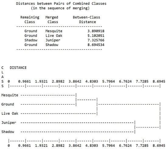 The J–M distance between all classes was greater than 1.9 except between juniper and live oak. The result for the latter two was expected because of their similar heights and spectral components (Table 1). A dendrogram, commonly used to hierarchically cluster taxa or classes, yielded results similar to those of the separability report—showing a close similarity between the juniper and live oak classes due to their spectral and physical similarities (Figure 4). In contrast, the J–M distance between classes, such as mesquite and shadow, which have very different spectral signals, was large.