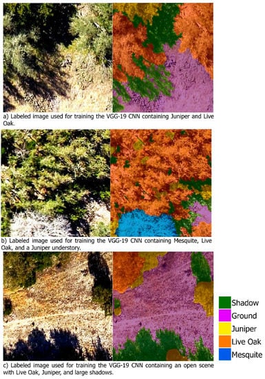 Collecting training samples for the VGG-19 semantic segmentation method required a different approach. Rather than single pixels being collected, sample images with all pixels labeled with one of the five classes were created from full drone scenes. For labeling convenience, 50 512 × 512-pixel images were labeled in MATLAB® Image Labeler application. The images covered a total of 635m2, including 127 junipers, 103 live oaks, and 36 mesquites (appropriately representing each tree species’ relative abundance in our study area). To create a training set for model fitting, we subsampled each of the 50 images to randomly select 1000 224 × 224 images. Figure 6 shows sampled labeled data.