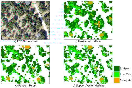 A comparison of the 3 traditional and classical machine learning algorithms used to classify the woody plant species in our study area. (a) The 10 cm orthomosaic. (b) ML tended to overestimate mesquite cover, as well as total tree cover with what was generally shadow. (c) RF was similar to ML, overestimating tree cover with shadow. (d) Overall, SVM was more robust in parsing between shadow and canopy cover for the three tree species.