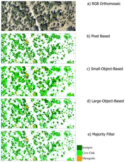 A comparison of the 4 methodologies (using SVM) employed to classify the woody plant species in our study area. (a) The 10 cm orthomosaic. (b) The pixel-based method provided decent accuracies but suffered from a strong salt-and-pepper effect (c) The small-object-based method attained better classification accuracies than the pixel-based method, while also providing a clearer representation of the landscape (d) The large-object-based classification most accurately depicted tree canopies; however, it lacked overall and class accuracies, due to a greater number of mixed pixels. (e) The post-classification majority filter attained the highest scores overall and class accuracies; however, it tended to underestimate total canopy coverage for all three woody plant species.