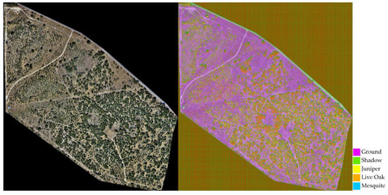 The drone imagery was acquired between 10 a.m. and 12 p.m. on 3 December 2018, with a DJI Phantom 3 Pro (Shenzhen Dajiang Baiwang Technology Co., Ltd., Shenzhen, China) drone with a Sony 1/2.3” CMOS RGB Sensor and a FOV 94° 20 mm lens (Sony Semiconductors Solutions Corporation., Ltd, Kanagawa, Japan). A total of 999 images were collected at a flying height of 50 m, covering approximately 346 acres of the 3462-acre site in 6 consecutive flights, each taking approximately 14 min, with a total flight time of about 84 min. Weather conditions were sunny with no wind. The flight took place in December to take advantage of the individual woody species’ unique ecophysiologies; during this season, the mesquite trees are leaf-off, the live oaks are showing a decline in greenness, and the junipers are dark shades of green.