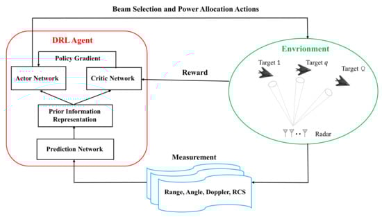 where represents the operation of taking the main diagonal elements. denotes the covariance matrix of the one-step predictive state . According to Section 3.1, the covariance matrix represents the prediction error of target state, and the agent can determine how to allocate resource by comparing the prediction error of all targets. Moreover, the predictive states of all of the targets are also included in the agent state vector, whose aim is to utilize the target state information, such as the targets’ ranges, the speeds and the RCS, to assist the agent in judgment. As , the DRL agent tends to allocate more power and beam resources to the targets with larger prediction errors to ensure their tracking performances [].
