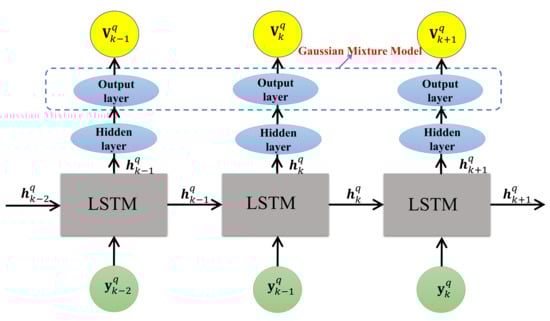 - Considering the possible existence of a model-mismatch problem in maneuvering target tracking, the long short-term memory (LSTM) [] incorporating the Gaussian mixture model (GMM), say, LSTM-GMM, is used to derive prior information representation of targets for resource allocation. The biggest change exists in the output layer of LSTM; there, two different GMMs are utilized to describe the uncertainty of state transition of the maneuvering target and radar cross-section (RCS), respectively. In this way, at each tracking interval, the LSTM-GMM will not output a determined predicted extended target state, but multiple Gaussian distributions. Then, we select one of them randomly according to mixed coefficients, to obtain the predicted target state and RCS, and the Bayesian information matrix (BIM) of prior information at the next tracking time instant.