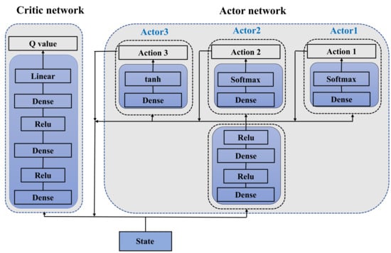 In the same way, we concatenate the outputs of the hidden layer, actor 1 and actor 2, and import it into actor 3. Actor 3’s activation function is set to the tanh function. The calculation formula is as follows: