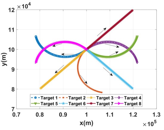The targets and the radar are depicted in the Cartesian coordinate system. Without loss of generality, the parameters of the radar system are set as follows: the radar system is assumed to be located at , the signal effective bandwidth and effective time duration of the qth beam are set as MHz and ms, respectively. The carrier frequency of each beam is set as 1 GHz, and thus, the carrier wavelength is m. The time interval between successive frames is set as 2 s, and a sequence of 50 frames of data are utilized to support the simulation. The lower and upper bounds of the power of the qth beam are set to and , respectively. The maximum number of beams is 5 and the target number is 8. For better illustration of the effectiveness of the proposed method, the initial positions and initial velocities of the targets are set the same, i.e., and . The turning frequency of turn motion targets is set to 0.0035 Hz. The motion parameters of each target have been listed in Table 1, where the symbol “*” indicates that a motion mode does not include this motion parameter. The real moving trajectories of the three targets are depicted in Figure 4. As shown in Figure 4, Target 1 and Target 4 are doing right-turn motion, Target 2, Target 5 and Target 8 are doing left-turn motion; Target 3, Target 6 and Target 7 are doing uniform linear motion.
