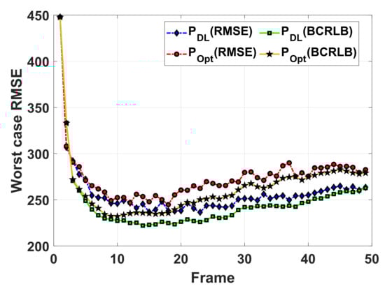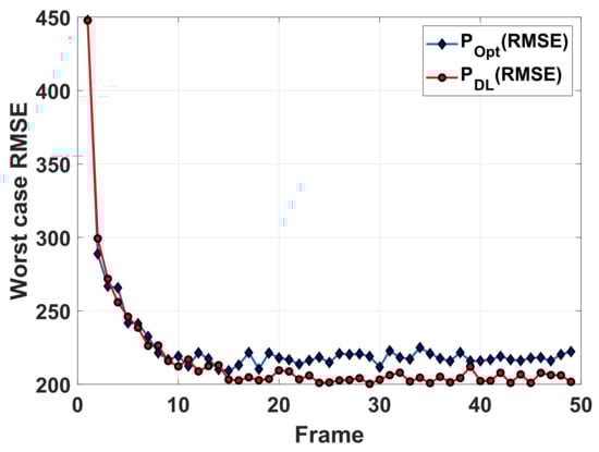 To better illustrate the effectiveness of the RNN-based prediction network, an additional simulation experiment is conducted, where the optimization-based method is used to solve cost function (5) based on the prior information representation derived from the prediction network. In Figure 8, the curve labeled “” represents the worst case tracking RMSE of the RNN-optimization-based method. It can be seen that this curve almost coincides with that of the proposed data-driven method and is also higher than that of the optimization-based method. This shows that the cost function (5) can be optimally solved with the method in [] once a one-step predictive state is accurate enough. According to the comparison shown in Figure 8, it is known that, as , the tracking performance improvements brought from the proposed method are mainly due to the usage of the RNN-based prediction network.