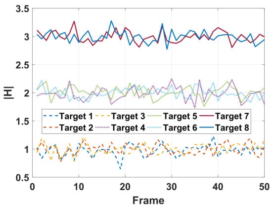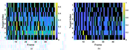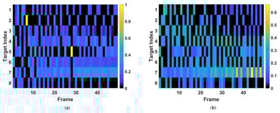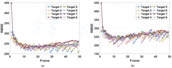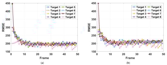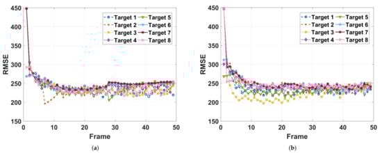 where is the number of Monte Carlo trials, denotes the 2-norm, and is the estimate of the qth target’s state at the -th trial with Kalman filter [].