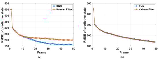 Furthermore, a prediction performance comparison of the RNN-based prediction network and the Kalman filter is given in Figure 9, where the power is fixed during tracking. We first compare the RMSE of the predictive state of Target 2 (doing left turns) with the RNN and Kalman filter. The results are shown in Figure 9a, in which the prediction performance of RNN is higher than that of Kalman filter with the CV model because the model mismatch problem is avoided to a certain extent. Additionally, Figure 9b shows a comparison of the two methods of Target 3 (doing uniform linear motion). Here, Target 3 is taken in order to avoid the influence of model-mismatch. It can be seen that, different from that of Target 2, the RMSE curves of the two methods almost coincide, which implies that the performance of the RNN-based prediction network is very close (almost the same) to that of the Kalman filter with the true model (CV model), and thus, we believe that the RNN-based prediction network is able to replace the model-based prediction for target tracking in the applications of radar system resource allocation.