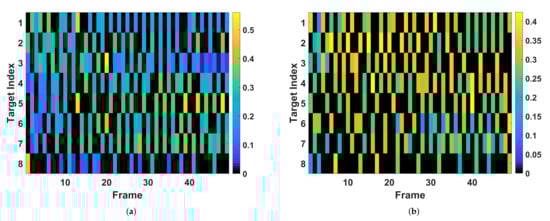 In Figure 7a,b, it can be seen that more power and beam resource tend to be allocated to targets that are moving away from radar, i.e., target 4, target 5, target 6, and target 7, for achieving a larger gain of tracking performance. Actually, the resource allocation is not only determined by targets’ radial distances but also by radius speeds, especially when the targets are close enough. As shown in Figure 7a, comparing the allocation results of these targets that are approaching the radar, e.g., Target 1, Target 2, Target 3, and Target 8, we discover that more power tends to be allocated to the beam pointing to the closer Target 1 because Target 1’s larger radial speeds may cause a larger BCRLB. When using the CV model for prediction, the beam selection and the power allocation are mainly determined by comparing the radius distances of different targets. For example, for the resource allocation solution of Target 1, Target 2, Target 3 shown in Figure 7b, more power and beam resources tend to be allocated to the farther targets, Target 1 and Target 2, from about frame 20. Therefore, we believe the proposed method can provide more accuracy prior information of targets, which benefits the utilization effectiveness of resource allocation.