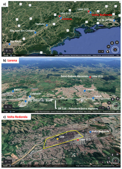 The first lidar campaign in the Paraíba valley was carried out in Lorena and Volta Redonda cities, whose geolocations are marked in red color in the map of the region of the Paraíba valley, see Figure 1a. The Rio de Janeiro and São Paulo megacities are also marked, as well as other important regions along the PDH.