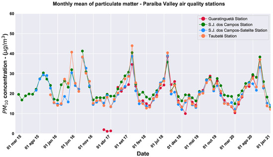 As mentioned earlier, in order to provide an air quality overview of the Paraíba valley region, monthly mean particulate matter concentrations were retrieved from four CETESB stations installed in three different cities, São José dos Campos (S. J. dos Campos and S. J. dos Campos-Satelite stations), Taubaté and Guaratinguetá, as can be seen in Figure 1. Concentration values of were used since it is the single common product for all stations.