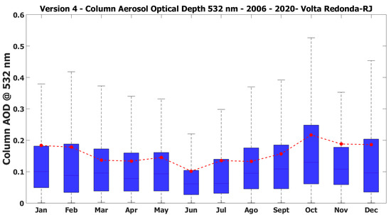 Whisker plots of the monthly AOD and lidar ratio from CALIOP/CALIPSO products at 532 nm over Volta Redonda-RJ, for the period of June of 2006 to December of 2020.