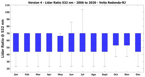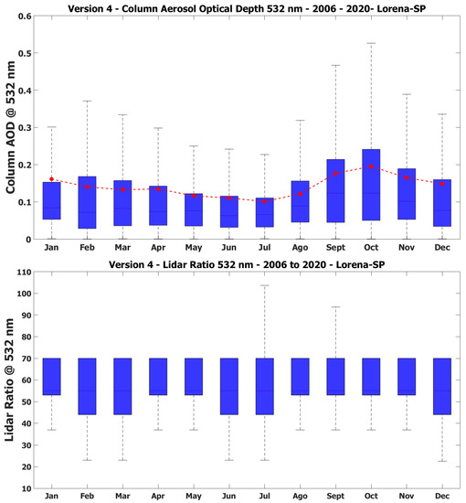 By analyzing aerosol optical depth values at 532 nm for both locations, we can see similar AOD annual patterns. Volta Redonda presents AOD mean values of , with the lowest mean value in June, , and the upper mean AOD in October . The whisker plot results present high variation in the interquartile range values in the months of September and October, where 50% of the total AOD values span from 0.06 to 0.25, as can be seen in Figure 3. Likewise, Lorena presents the same pattern of AOD values at 532 nm, with a mean AOD value of , with the lowest mean AOD of in July and the upper mean value of in October, as shown in Figure 4. The whisker plot results also present high variation in the interquartile range values in the months of September and October, where 50% of the total AOD values are allocated between values of 0.05 and 0.24, which agreed with the increase of the particulate matter concentration measured by the air quality stations of the Paraíba valley region, as presented in Figure 2. The analyses present the same rationale for CALIOP lidar ratio at 532 nm product for both locations. Lidar ratio products for Volta Redonda span from 44 sr to 70 sr most of the year, with a mean value of 55 sr for all months. In the case of the Lorena site campaign, the lidar ratio values span from 53 sr to 70 sr during most of the year, with mean values of 55 sr for all months, as can be seen in Figure 3 and Figure 4.