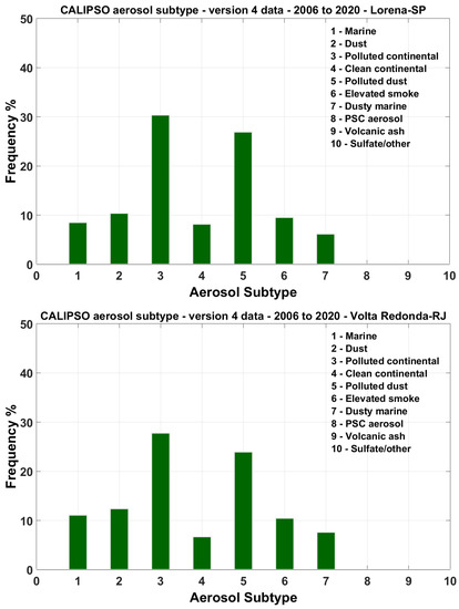 CALIOP’s aerosol subtype plays a critical role for the aerosol optical properties retrieval, more specifically, for extinction profiles of level 2 CALIPSO data. In the context of this work, the aerosol subtype classification is also important to derive the most relevant types of aerosol present in the atmosphere of the Volta Redonda and Lorena sites. As can be seen in Figure 5, it is possible to retrieve the most significant aerosol subtype from the histogram of aerosol subtype frequency. Volta Redonda presents relevant frequency values for polluted continental aerosol (≈28%), polluted dust (≈24%) and elevated smoke, with 11% occurrence from June 2006 to December 2020. The Lorena site follows the same pattern of aerosol classification, where most of the aerosol detected is flagged as polluted continental (≈30%) and polluted dust (≈27%).