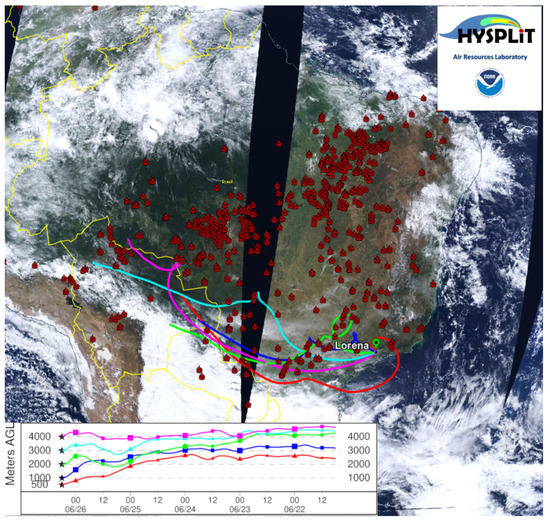 Five-day backward trajectories ending at Lorena site with different altitude levels, from 500 to 4000 m a.g.l., on 26 June 2014 at 06:00 UTC. Several fire focuses, represented by the red points, are detected by AQUA MODIS monitoring and retrieved from the biomass burning database from The National Institute for Space Research (INPE)—http://queimadas.dgi.inpe.br/queimadas/portal (accessed on 17 September 2021).