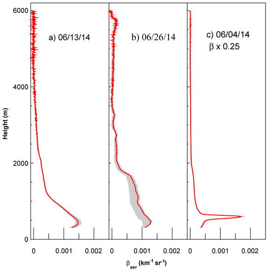 We first report on the results related to the Lorena campaign. Due to the very dry period in the 2014 Southern Hemisphere winter, the low frequency of rain provided several good quality measurements. The aerosol backscatter profiles corresponding to three representative days measured in bins of 100 s are presented in Figure 6. They were obtained by using the Klett inversion given by Equation (8). The background of the lidar measurement was determined by performing the linear fit described by Equation (5) considering an altitude range z from 6000 m to 7000 m a.g.l.