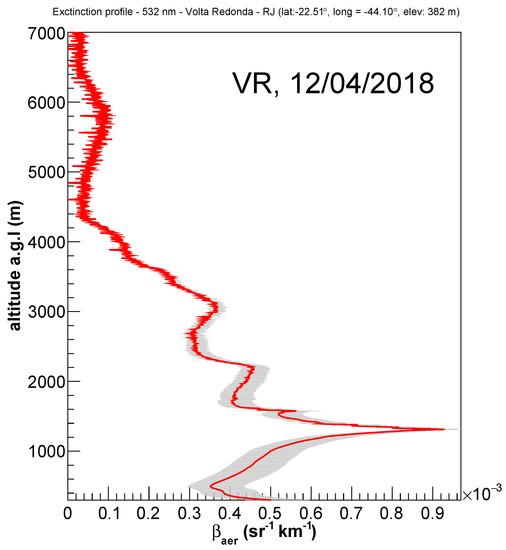 The lidar system was the only single remote sensing instrument employed during the measurement campaigns in Volta Redonda and Lorena. Considering a small underestimation of CALIOP lidar ratio values of for polluted continental aerosol type and for polluted dust reported in [65], we used the CALIOP data products as reference to constrain the lidar ratio value in order to retrieve the backscatter profiles. Based on the mean lidar ratio values obtained from the boxplot analysis (Figure 3 and Figure 4) and the aerosol classification frequency presented in Figure 5, a fixed lidar ratio value of sr was used in order to retrieve the backscatter aerosol profiles for both campaigns.