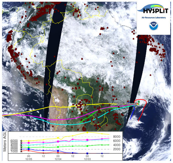 Three-day backward trajectories ending at Volta Redonda site with different altitude levels, from 1000 to 6000 m a.g.l., on 5 December of 2018 at 06:00 UTC. Several fire focuses, represented by the red points, are detected by AQUA MODIS and retrieved from the biomass burning database from the National Institute for Space Research (INPE)—http://queimadas.dgi.inpe.br/queimadas/portal (accessed on 17 September 2021).