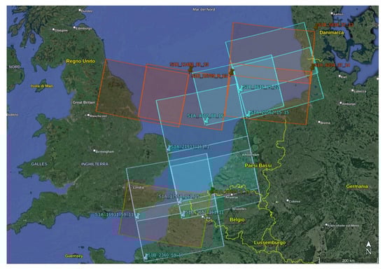 Atlantic European northwest shelf. Full-frame coverage is in orange and cyan for descending and ascending Sentinel-1 (S-1) Interferometric Wide Swath Ground Range Multi-Look Detected High-Resolution (IW) images, respectively. Background image (Data SIO, NOAA, US Navy, NGA, GEBCO; Image Landsat/Copernicus) is from Google Earth.