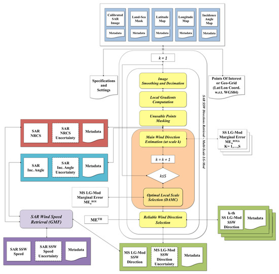 The scheme of the proposed methodology for the estimation of Synthetic Aperture Radar (SAR) Sea Surface Wind (SSW) speed and its uncertainty, and the Multi-Scale (MS) Local Gradient-Modified (LG-Mod) processing flowchart.